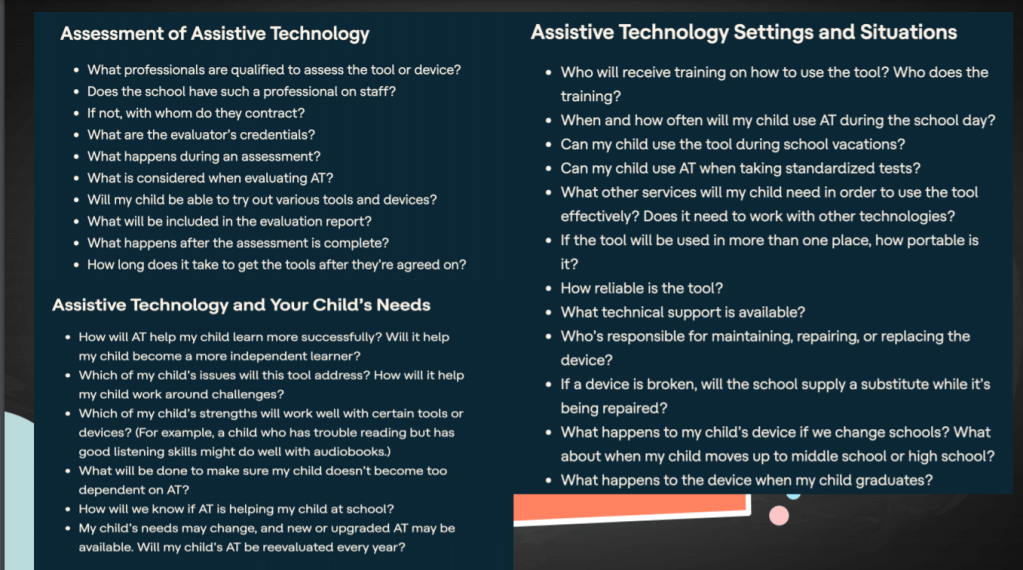 My classmates made a list of many important questions to ask when considering assistive technology.