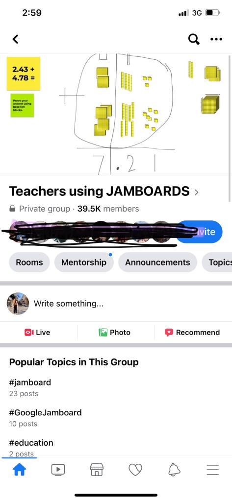 After learning I wanted to try it out for myself but it is difficult without having anyone to interact with. To find out more and see how educators are using this tool I dug a little deeper. I went straight to the source to learn more- teachers using Jamboard everyday. I joined a Facebook group and found many ideas of how teachers are using Jamboard in an online or blended classroom. I actually learn a lot from Facebook groups and appreciate the support felt by educators from all over the world.